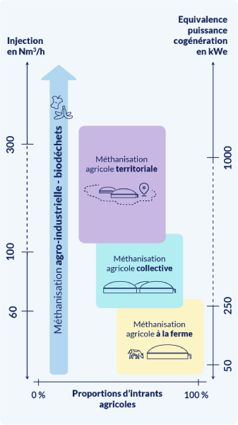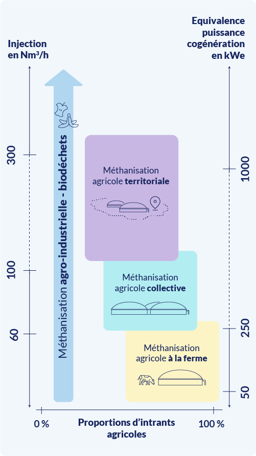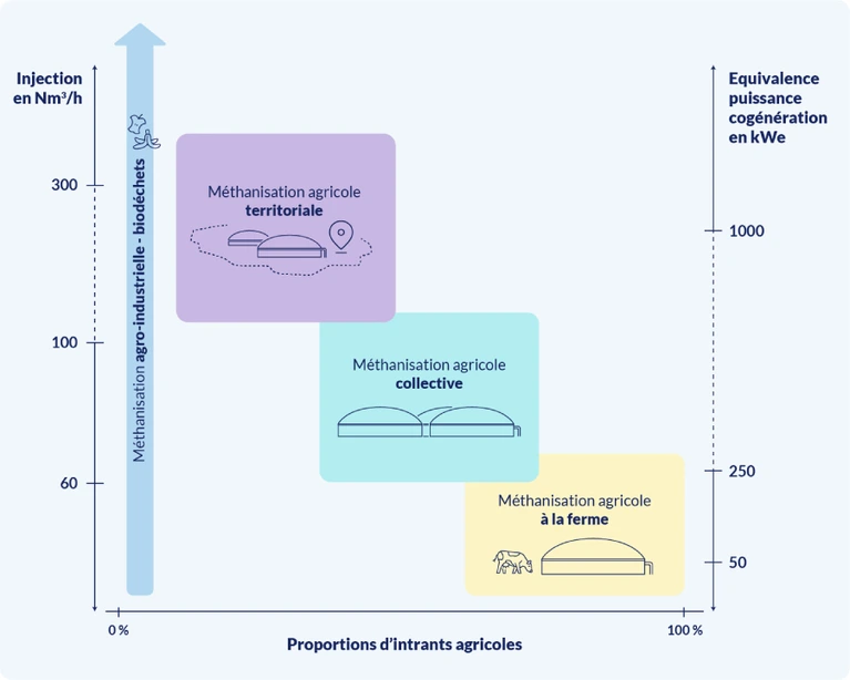 L’infographie présente trois types de méthanisation agricole, positionnés sur un graphique à deux axes.