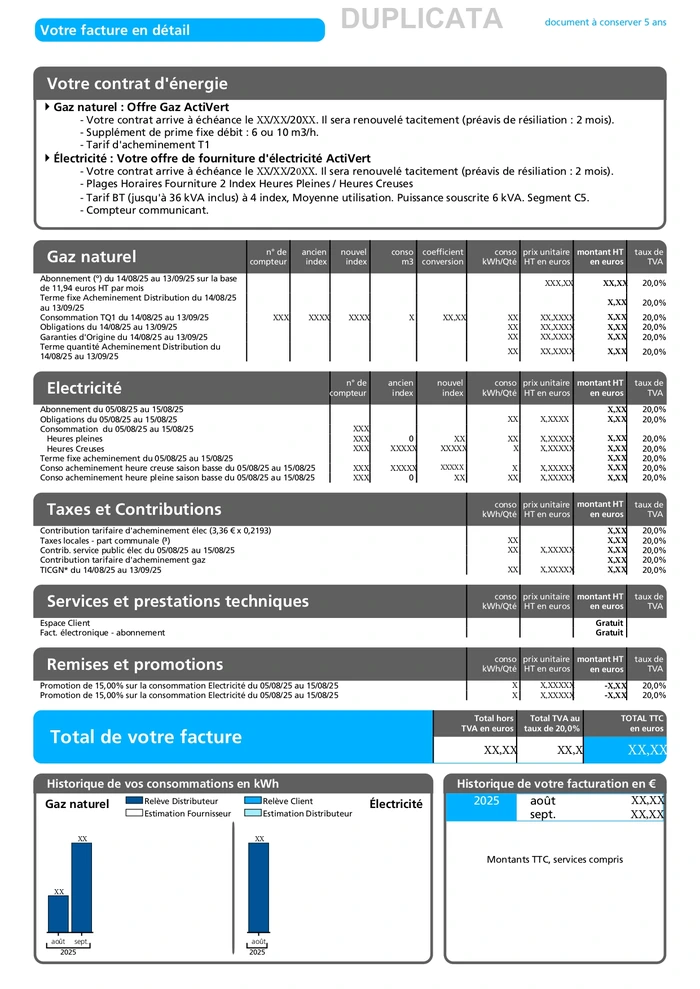 Les dates indiquées vous permettent d'avoir une indication sur le moment où votre prochaine facture sera éditée ainsi que la prochaine date de transmission d’un index par les distributeurs, Enedis pour l'électricité et GRDF pour le gaz.