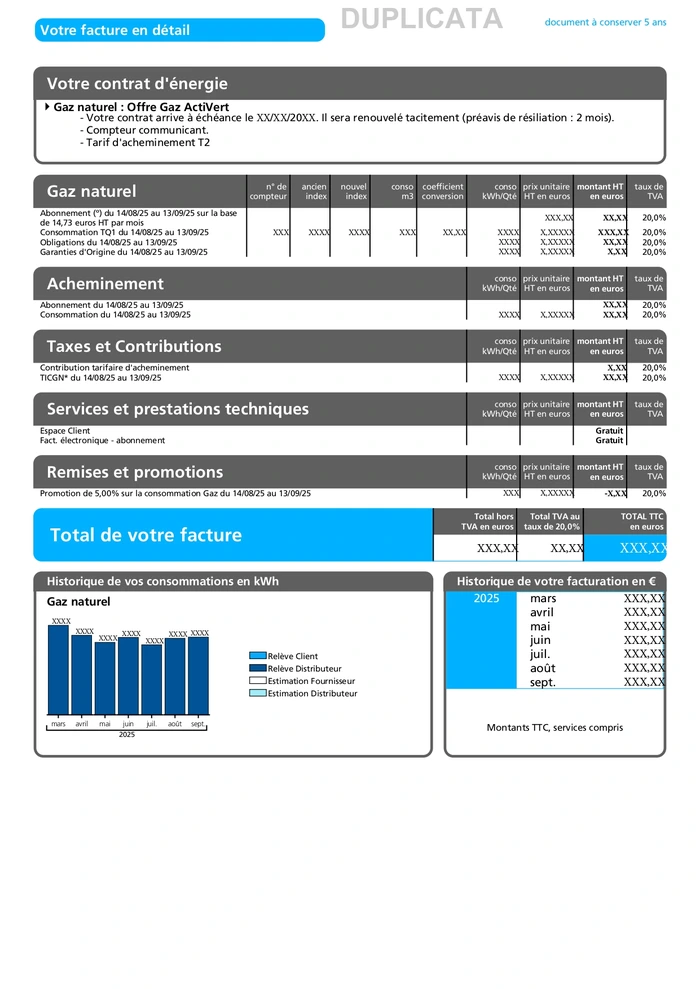 Le montant global de la TVA inclue la TVA à taux réduit (5,5 %) et la TVA à taux normal (20 %). La TVA à taux réduit s'applique à l'abonnement et à la contribution tarifaire d'acheminement. La TVA à taux normal s'applique à tous les postes à l'exception de l'abonnement, de la contribution tarifaire d'acheminement et des frais financiers (dont avance sur consommation). ENGIE est en option sur les débits. Vous pouvez donc reporter ce montant de TVA à réception de la facture pour votre déclaration de TVA déductible si vous êtes concerné par le dispositif.