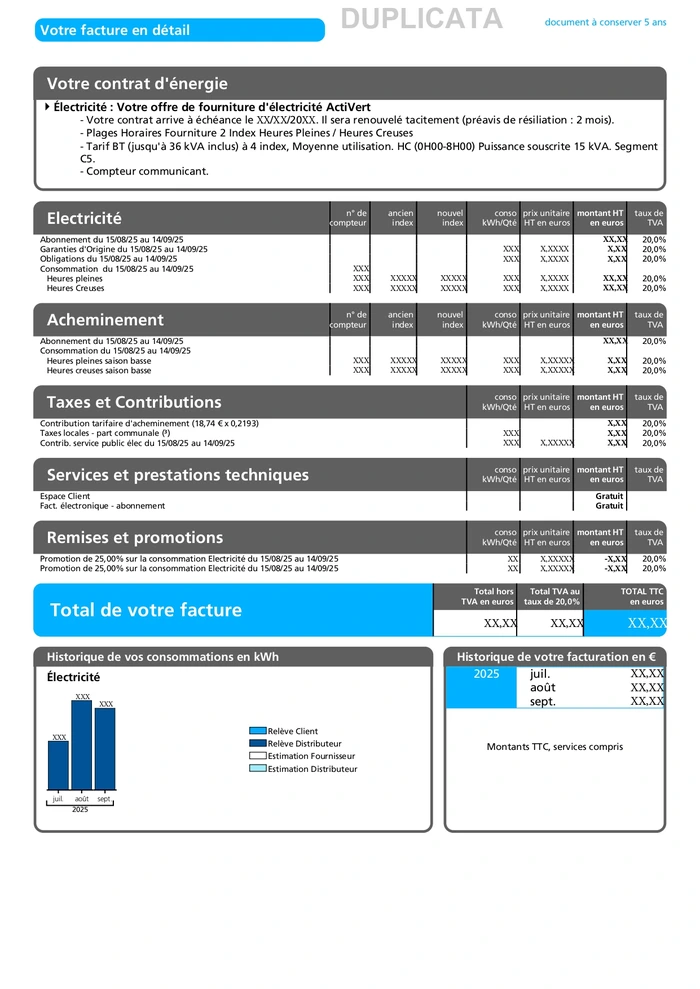 La consommation correspond à la différence entre l'index de fin de période facturé et l'index de début de période facturé. À cette consommation (en kWh), est appliqué le prix unitaire (en € HT) du kWh, afin de déterminer le montant dû pour la consommation d'Électricité. En fonction de votre contrat d'énergie, votre consommation peut être détaillée par plages temporelles (voir l'explication de votre contrat d'énergie pour en savoir plus).