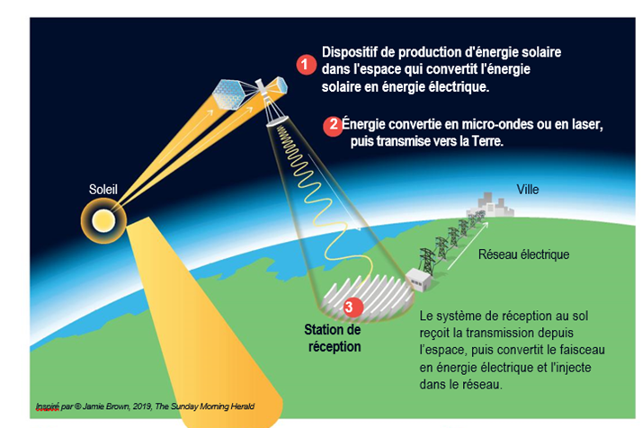 - Cette énergie est ensuite transformée en micro-ondes ou en laser et transmise vers la Terre.
