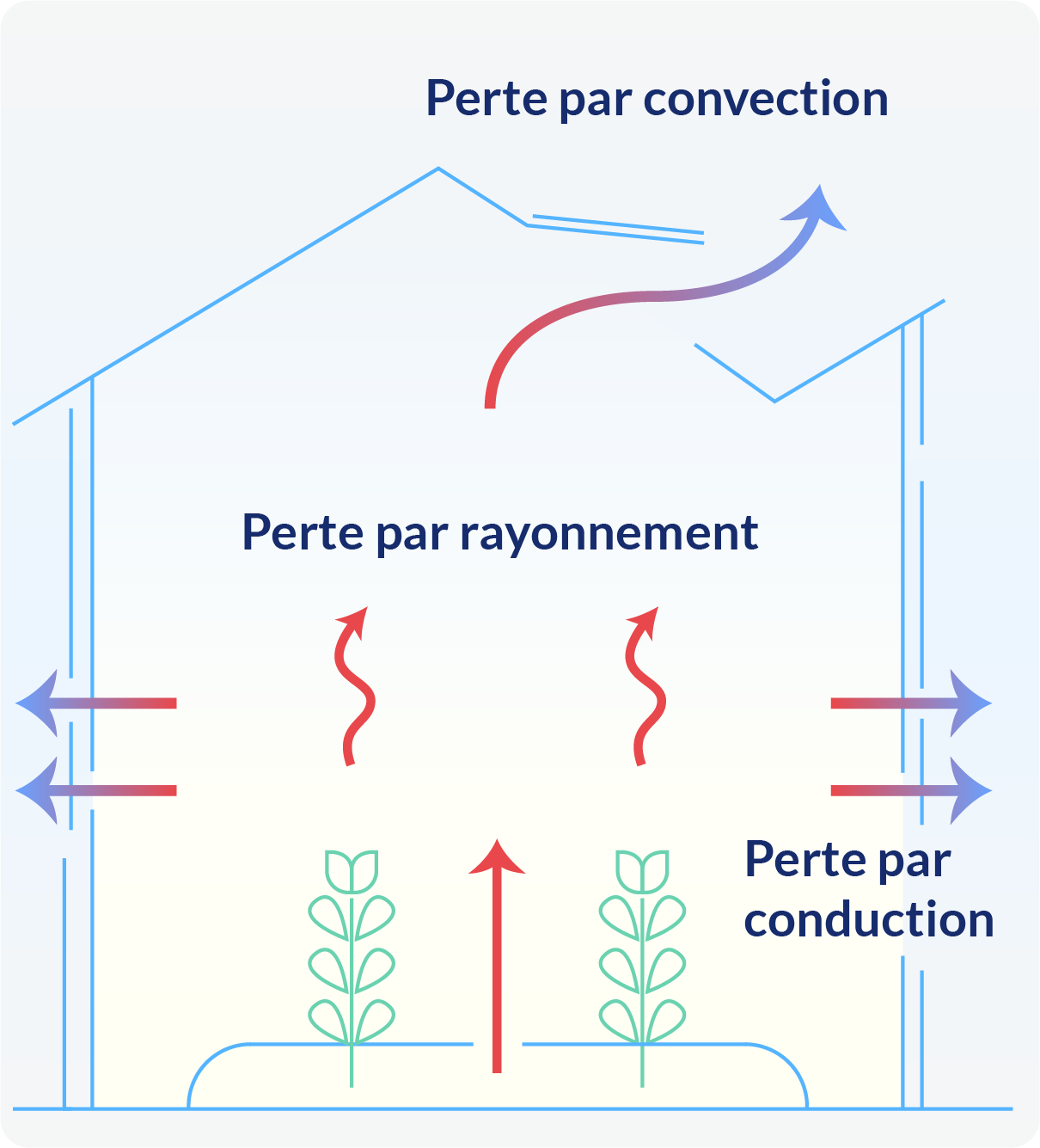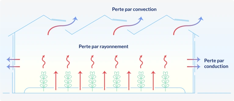 La serre est représentée avec des plantes vertes au sol, un toit et des murs visibles, et des flèches indiquant les directions des pertes de chaleur.